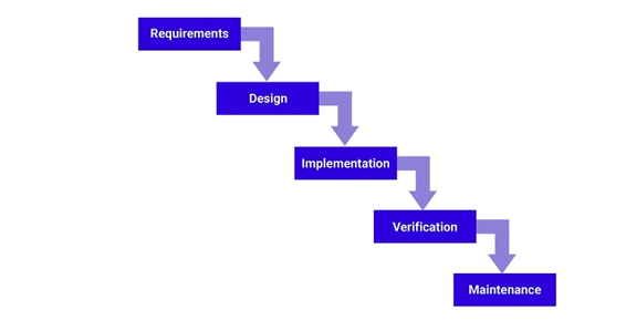 Many Consider the waterfall method to be the most traditional software development method. The waterfall method is a rigid linear model that consists of sequential phases (requirements, design, implementation, verification, maintenance) focusing on distinct goals.